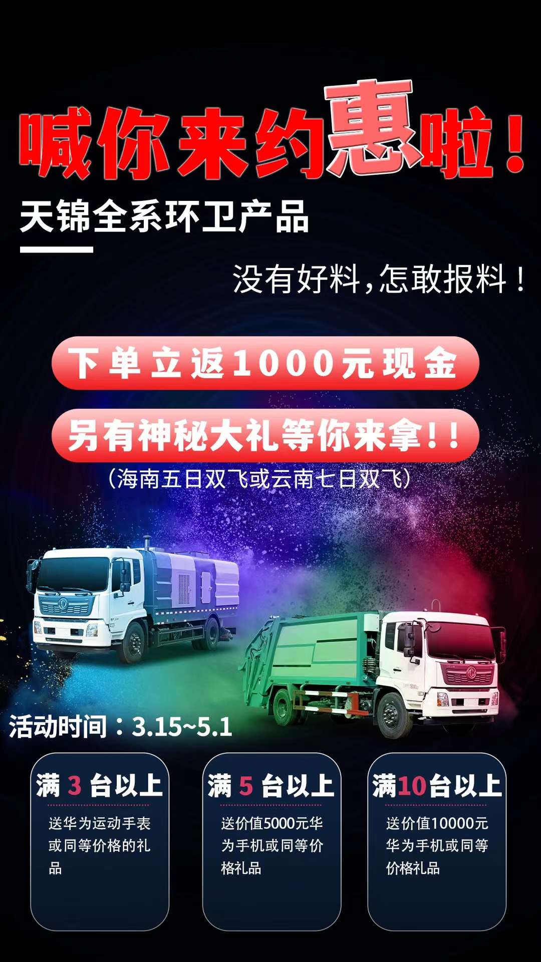 即日起至5.1日購程力集團天錦全系環衛,單臺下單立領1000元現金。